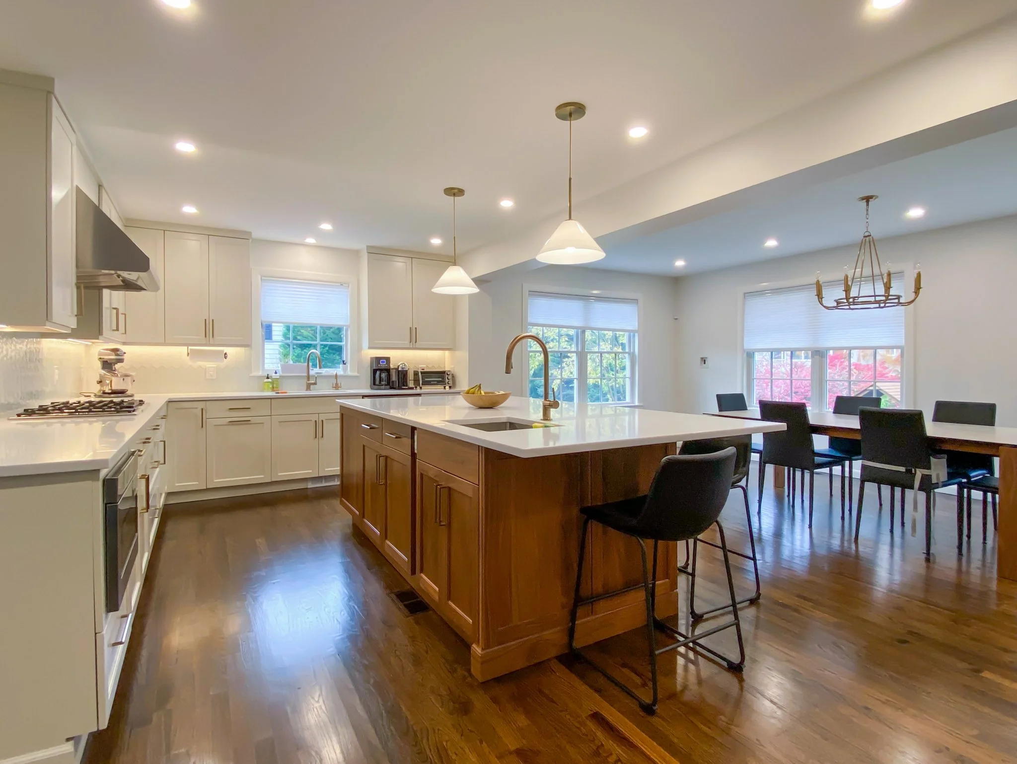 Our clients built an addition to their house in White Plans, New York, and their kitchen nearly tripled in size! This created a big, open space for their growing family. We designed the space with this busy family in mind, allowing the counter to run past the opening to the family room, so the parents can prepare meals while keeping an eye on the kids.