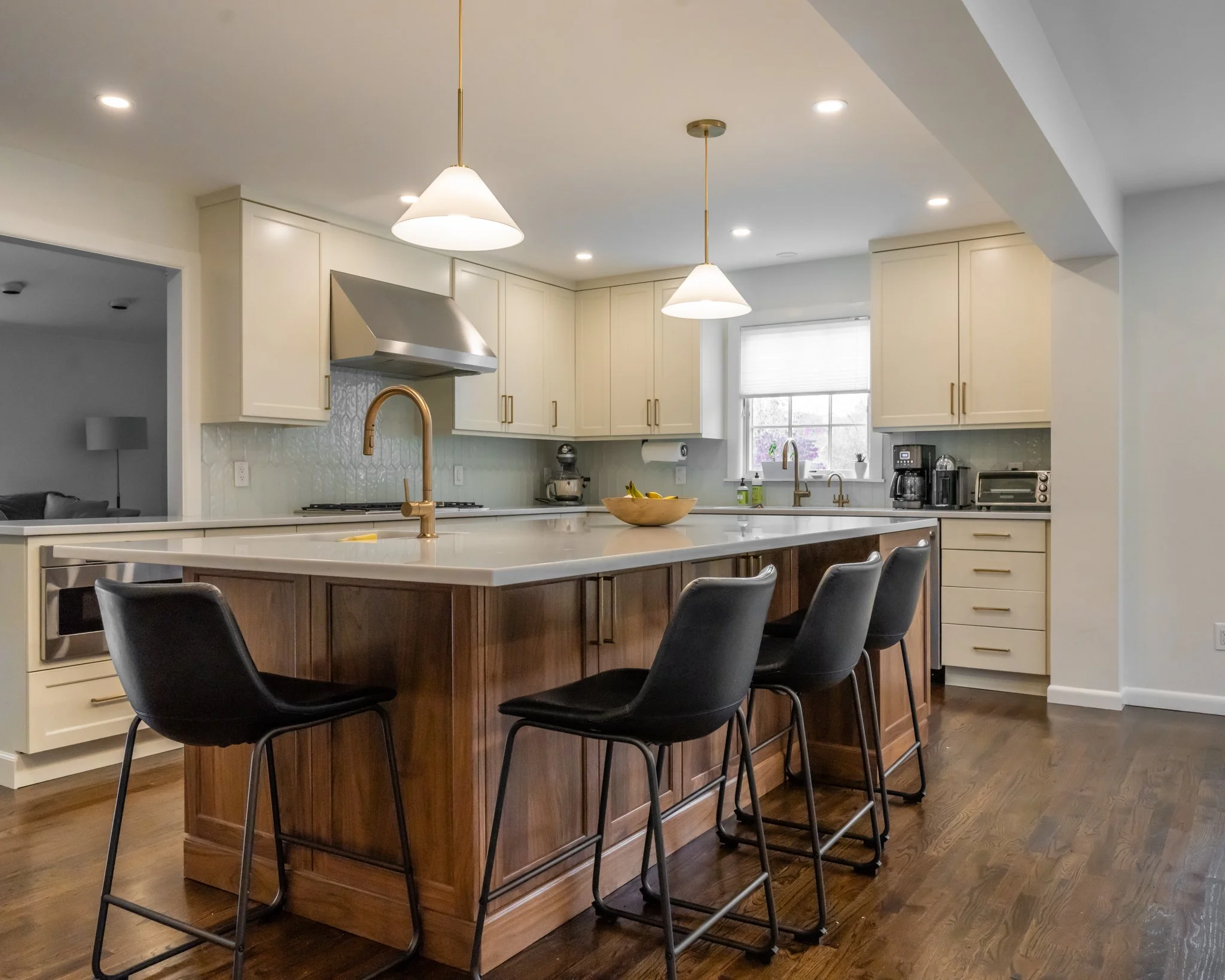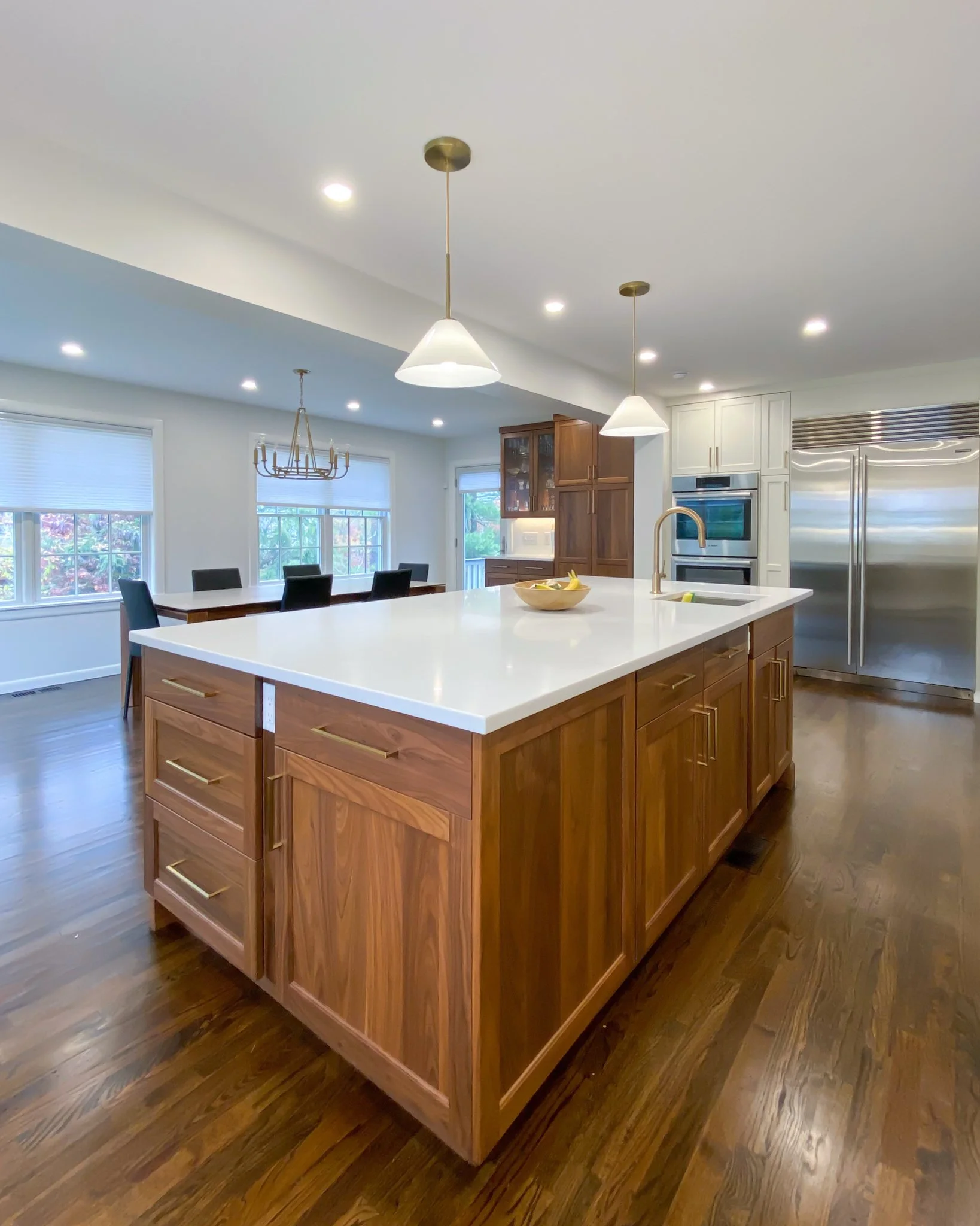 We used the Preston door style (recessed center panel with a rounded framing bead) from Crystal Cabinets, which creates a transitional look. They chose white painted cabinets for the exterior of the kitchen and stained walnut cabinets for the island and dining room piece.