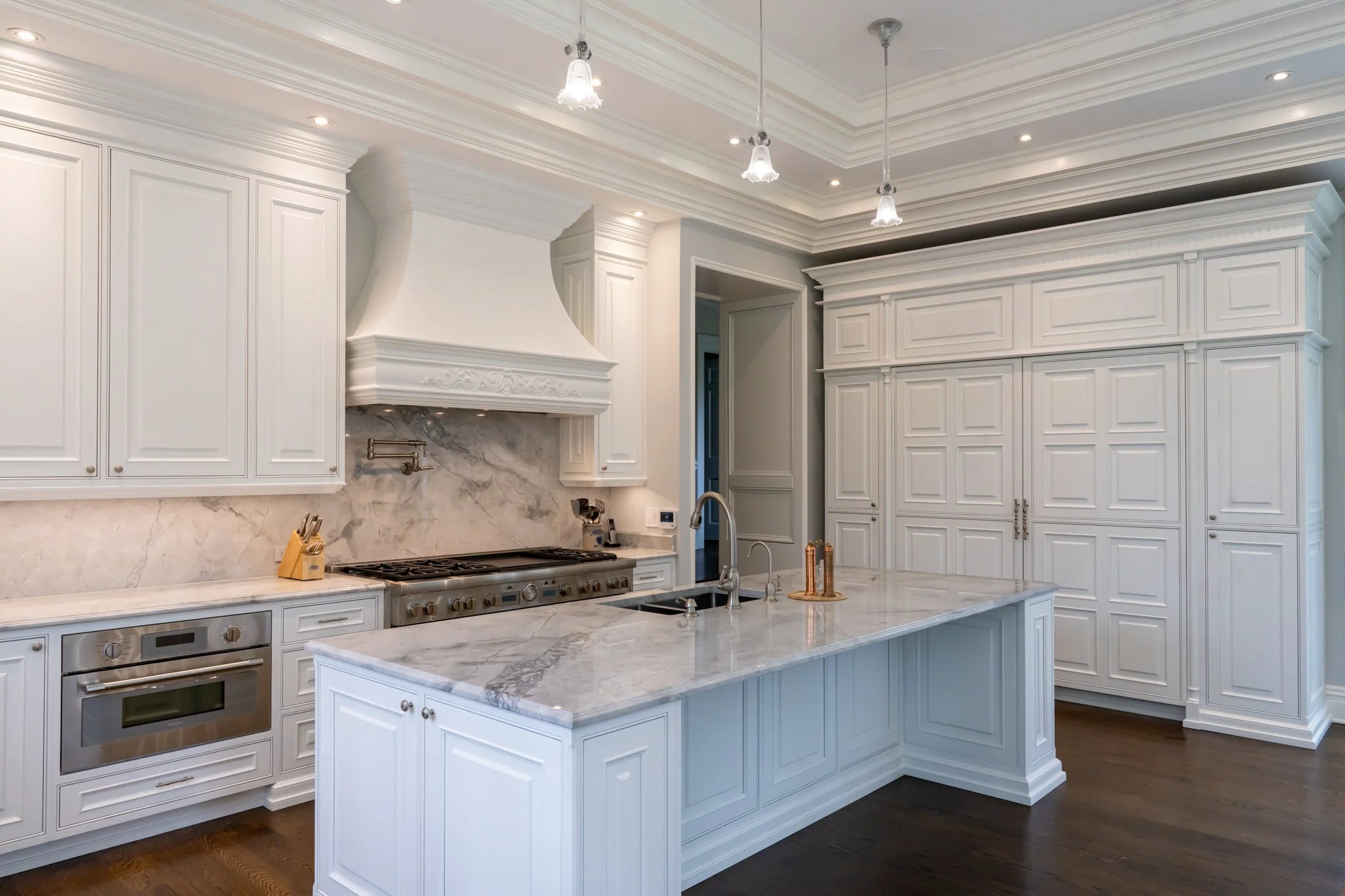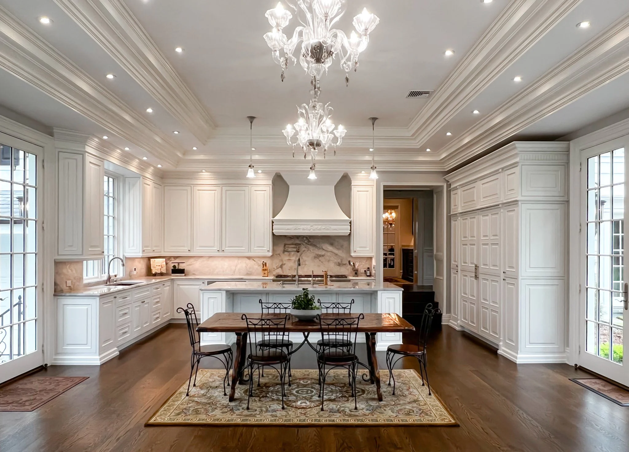 This large, open kitchen concept with a family room was a new addition to the house. We used white Craft-Maid Cabinets with a beaded inset and raised door panels throughout. The kitchen also features a 60" range, 64" cabinet hood, and a paneled refrigerator and pantries, which give the appearance of a furniture unit.