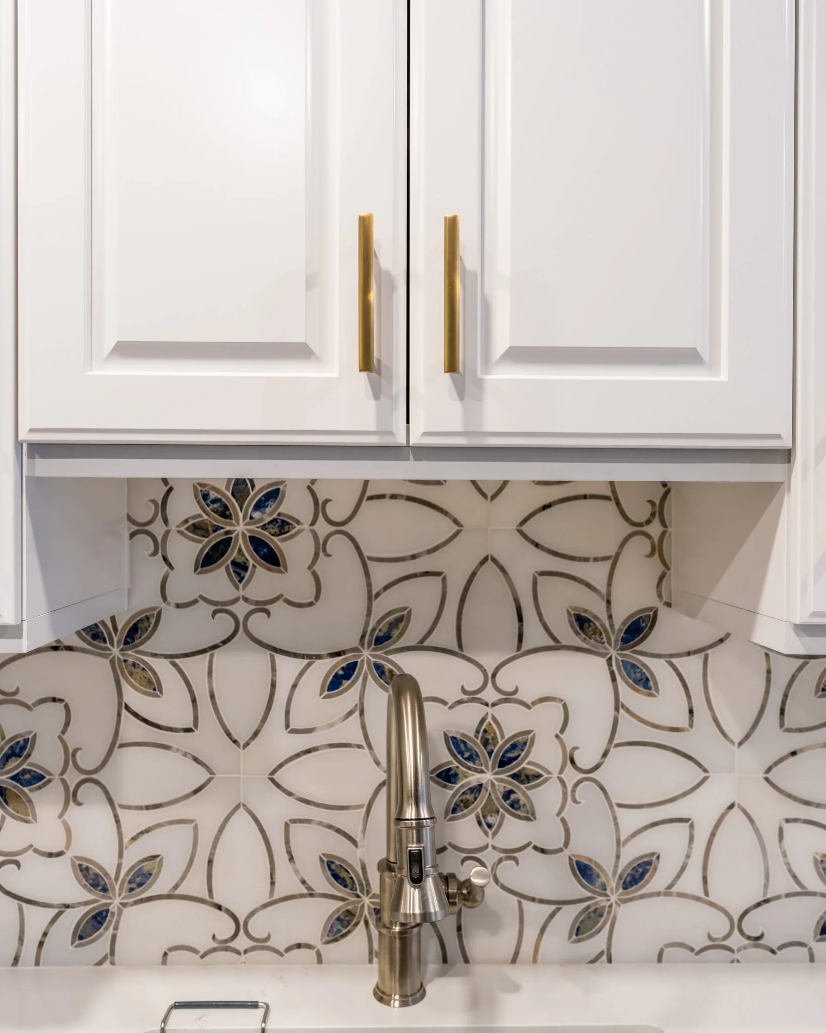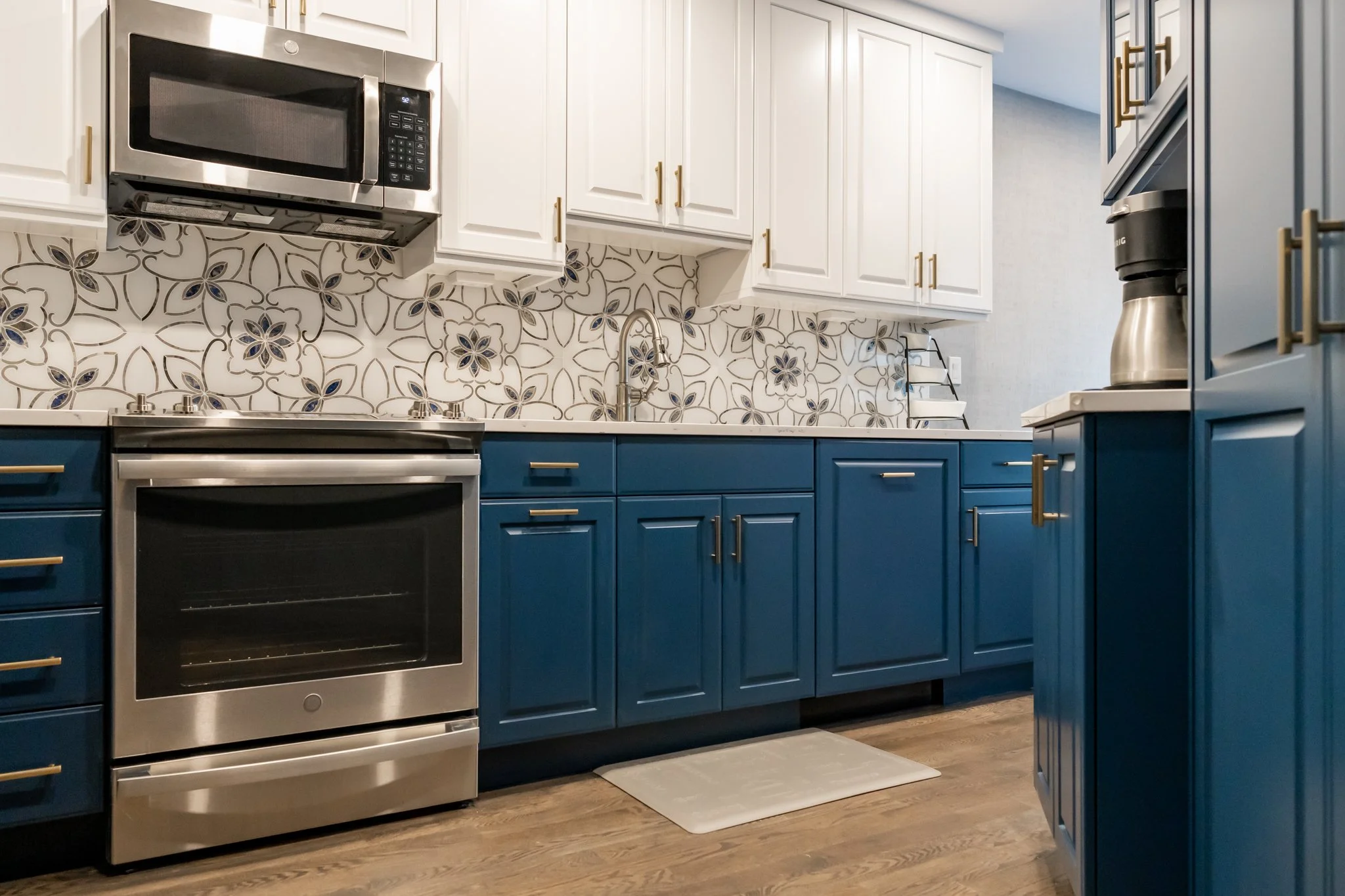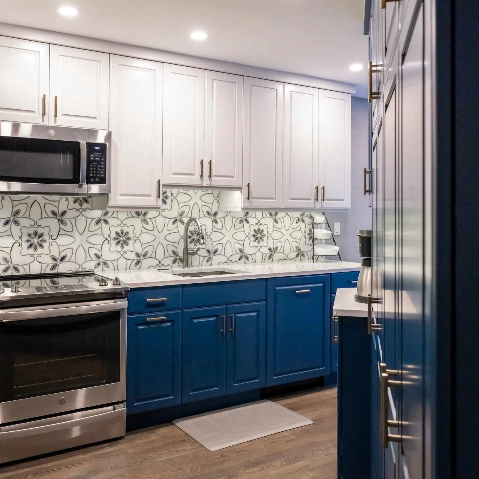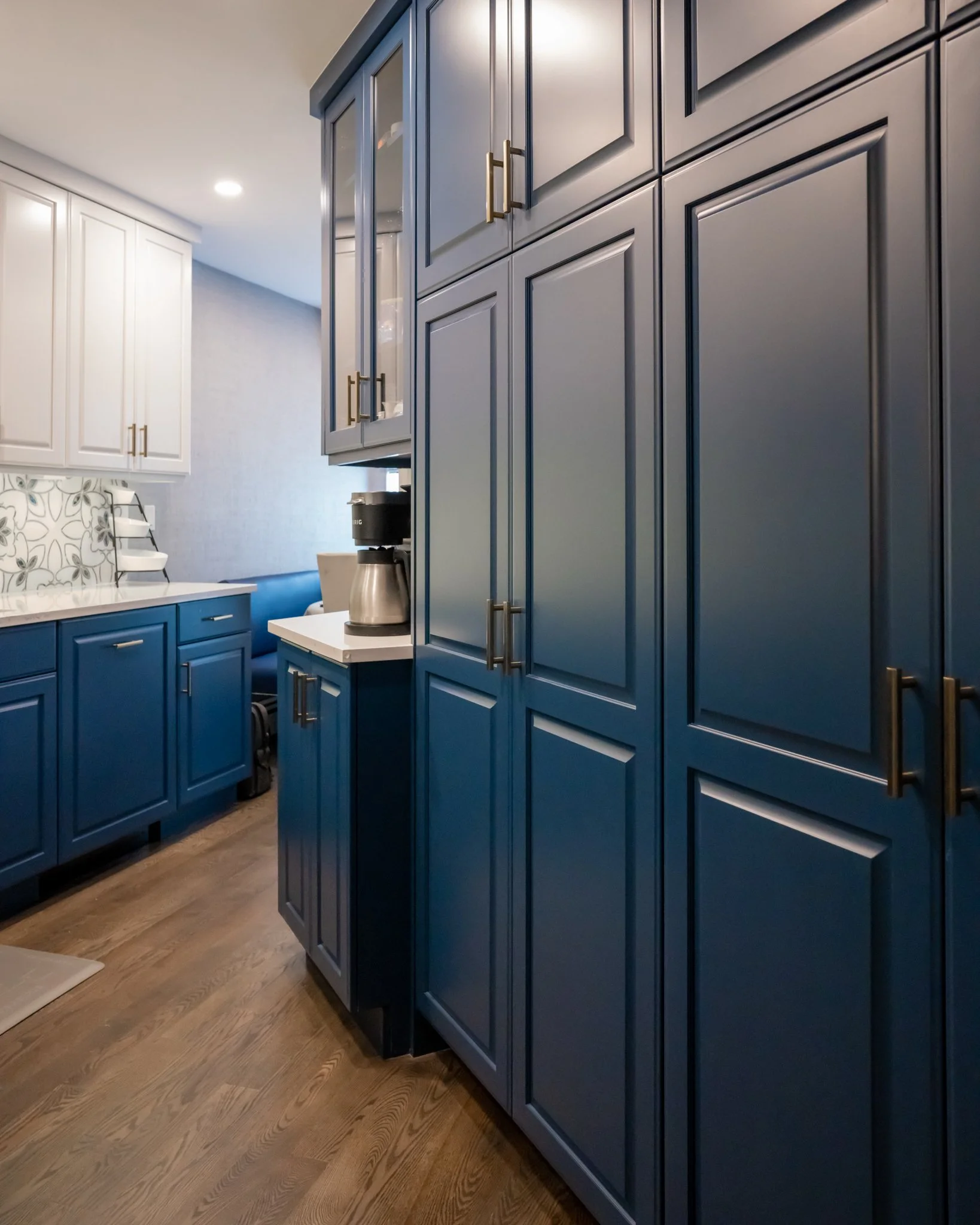 We used frameless, full-overlay Crystal cabinets with a raised panel in this angular kitchen. The white upper cabinets and blue lower cabinets are tied together by an elegant, decorative backsplash. The bronze hardware, white quartz countertops and medium-dark hardwood floors complete the look. Our goal was to maximize the area and create room to move throughout the kitchen.