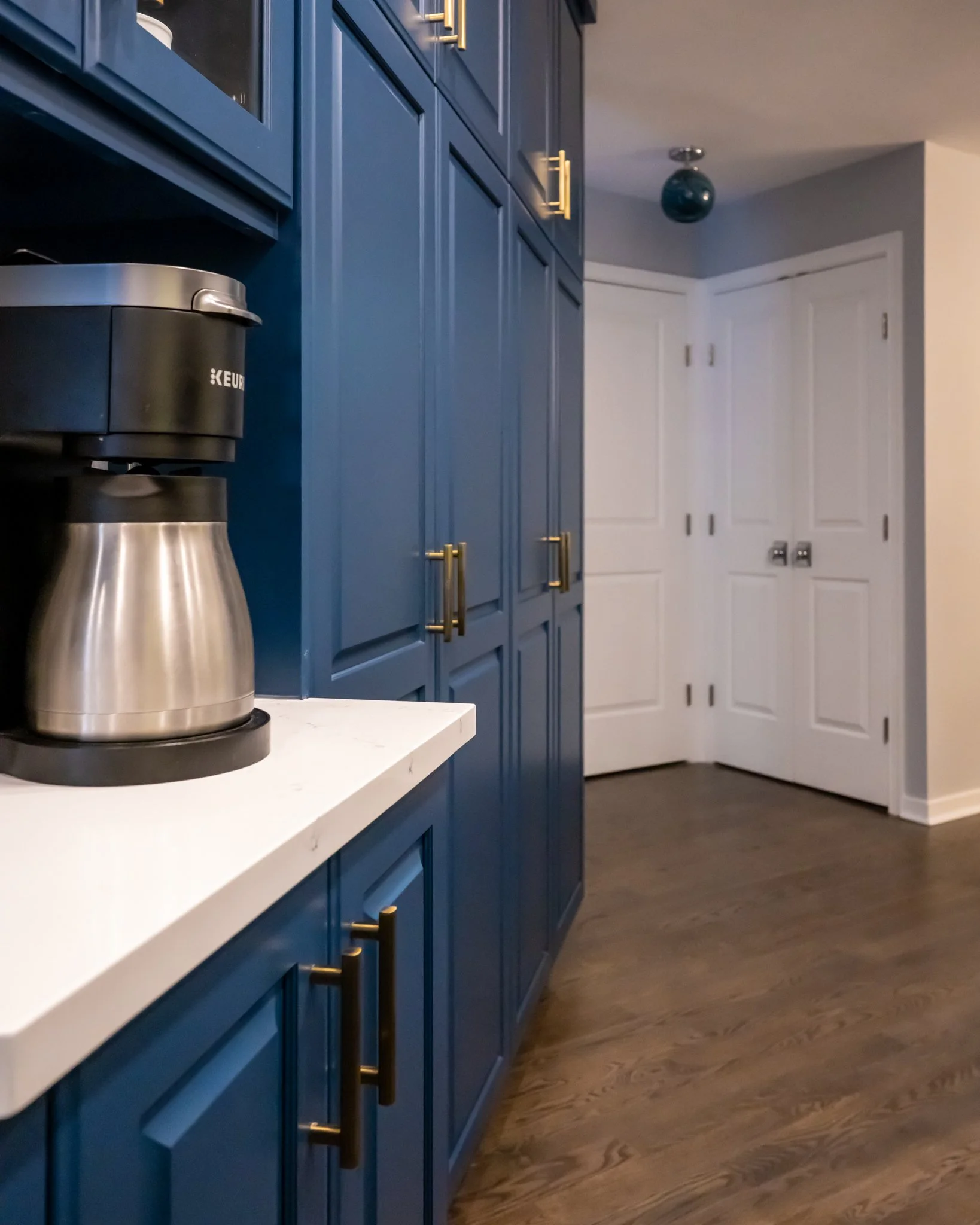 We removed a builders’ closet on the angled wall and replaced it with two large pantry cabinets which not only increased storage but allowed for more total space in the kitchen.