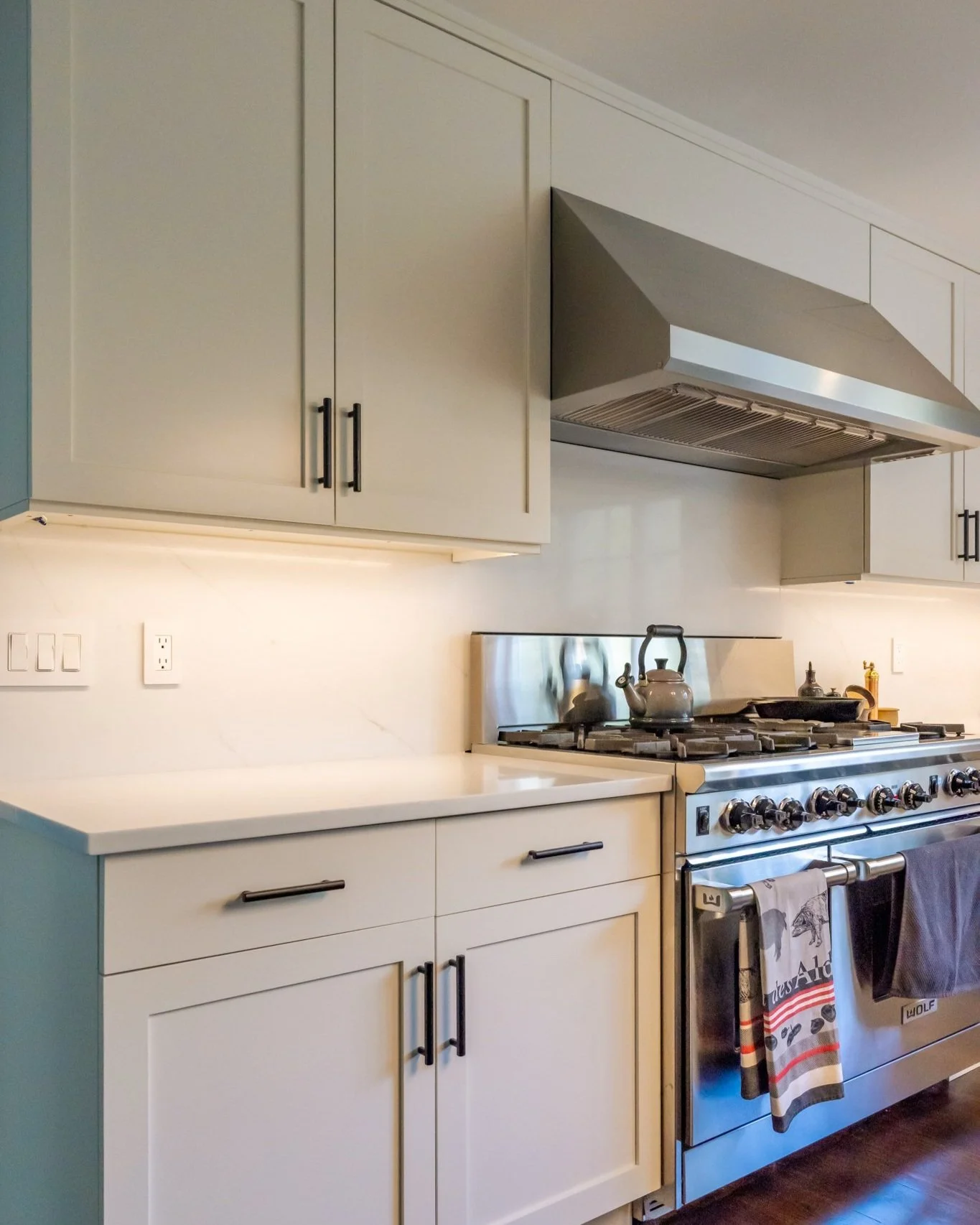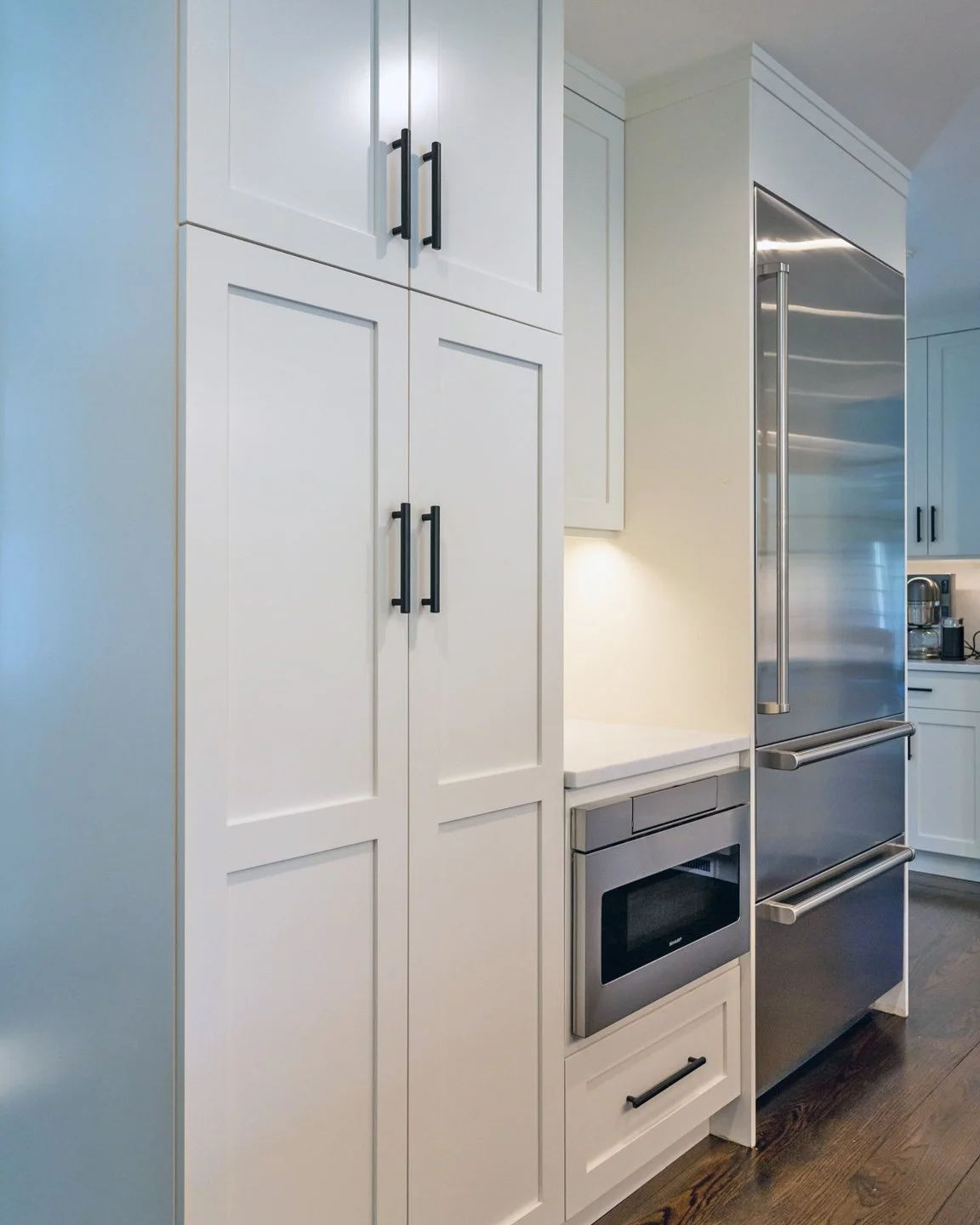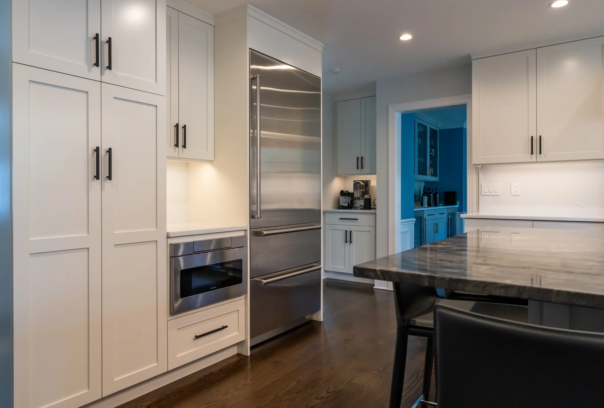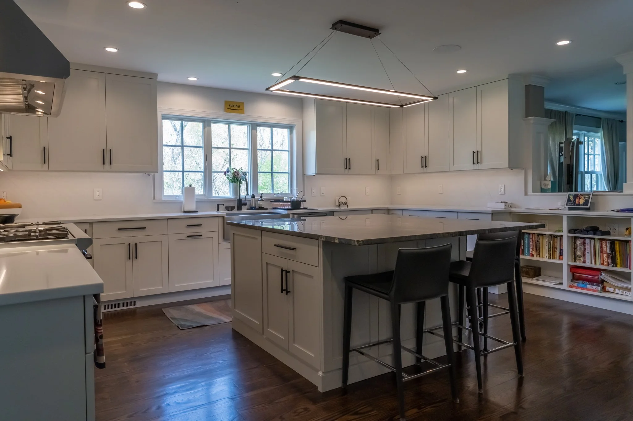 This kitchen features white shaker cabinets on the perimeter, professional appliances, and a large center island with grey shaker cabinets, conversational seating, and a unique countertop imported from brazil.