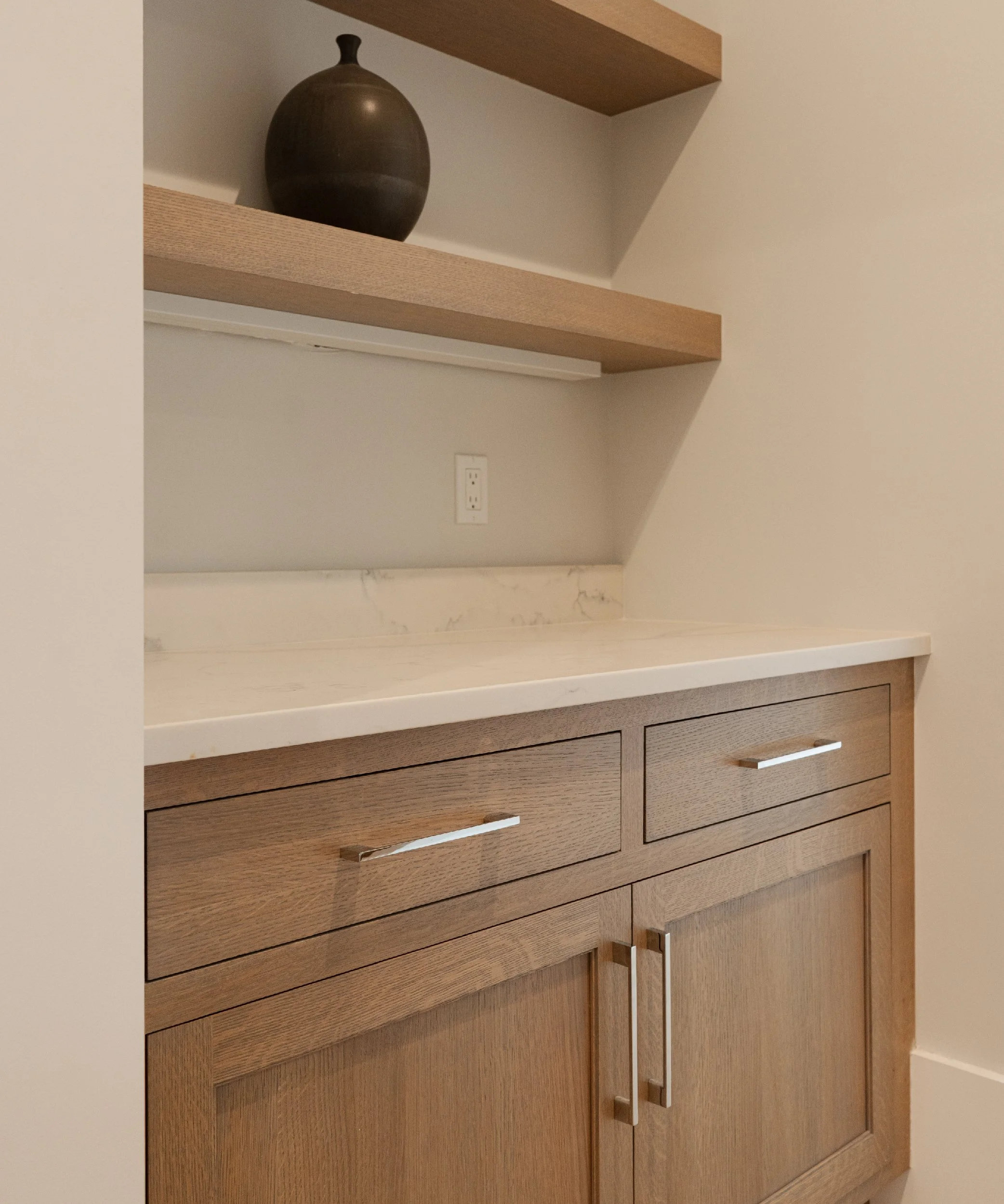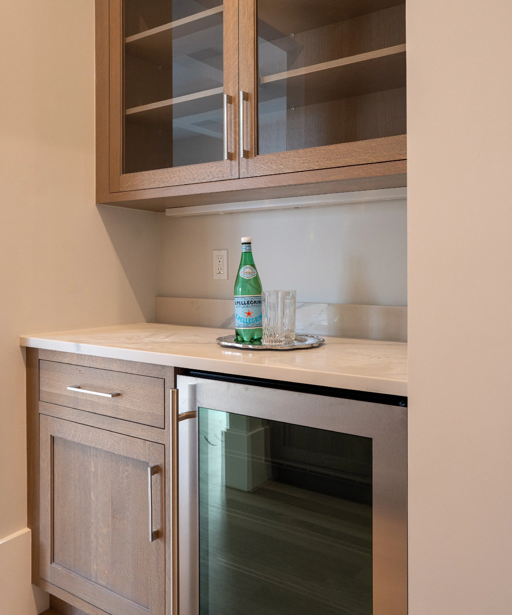 We also designed this butler pantry, which matches the island in the kitchen. It has a built in beverage refrigerator, two large floating shelves on either wall, and two four-foot countertops perfect for making drinks and staging food on its way to the dining room.