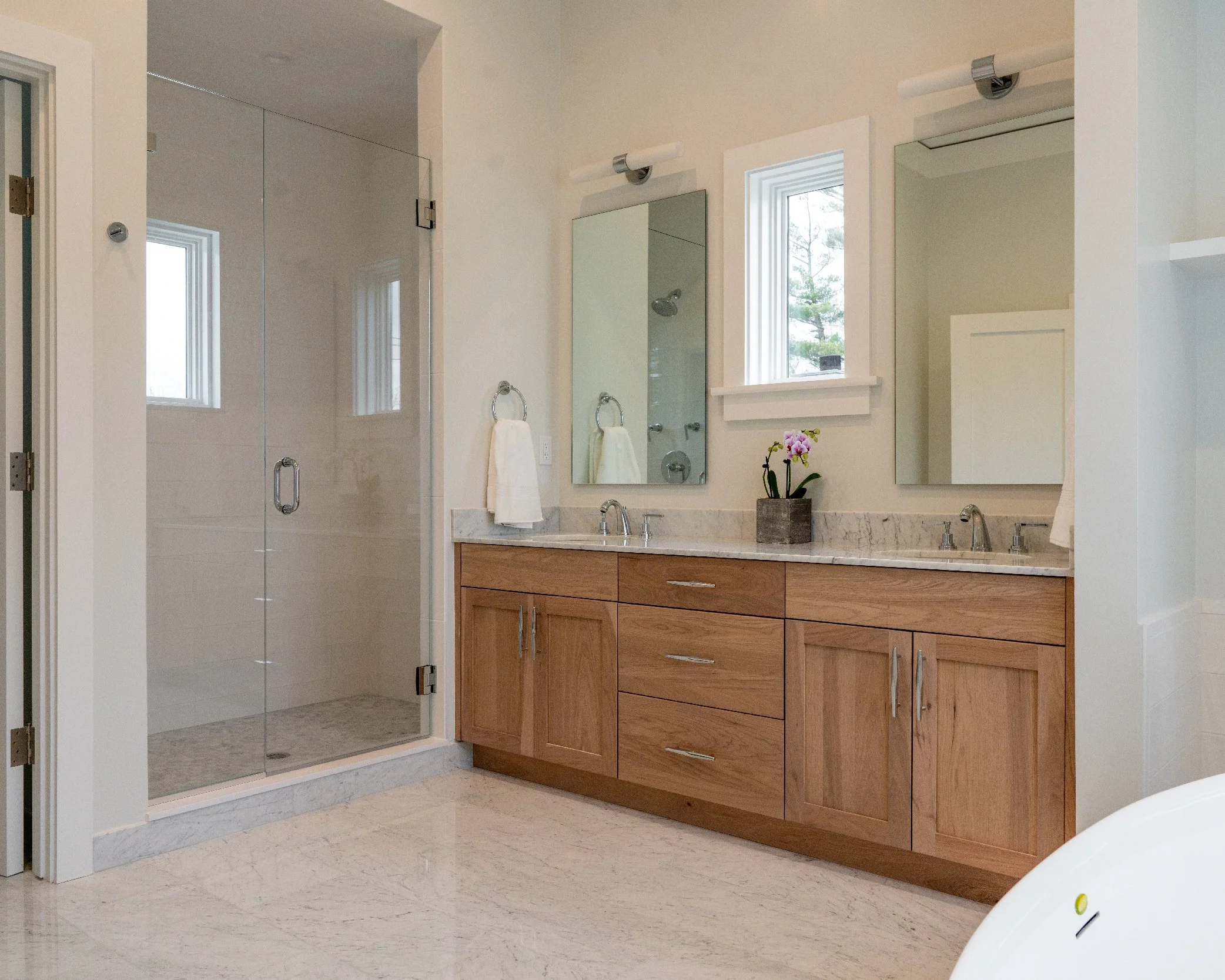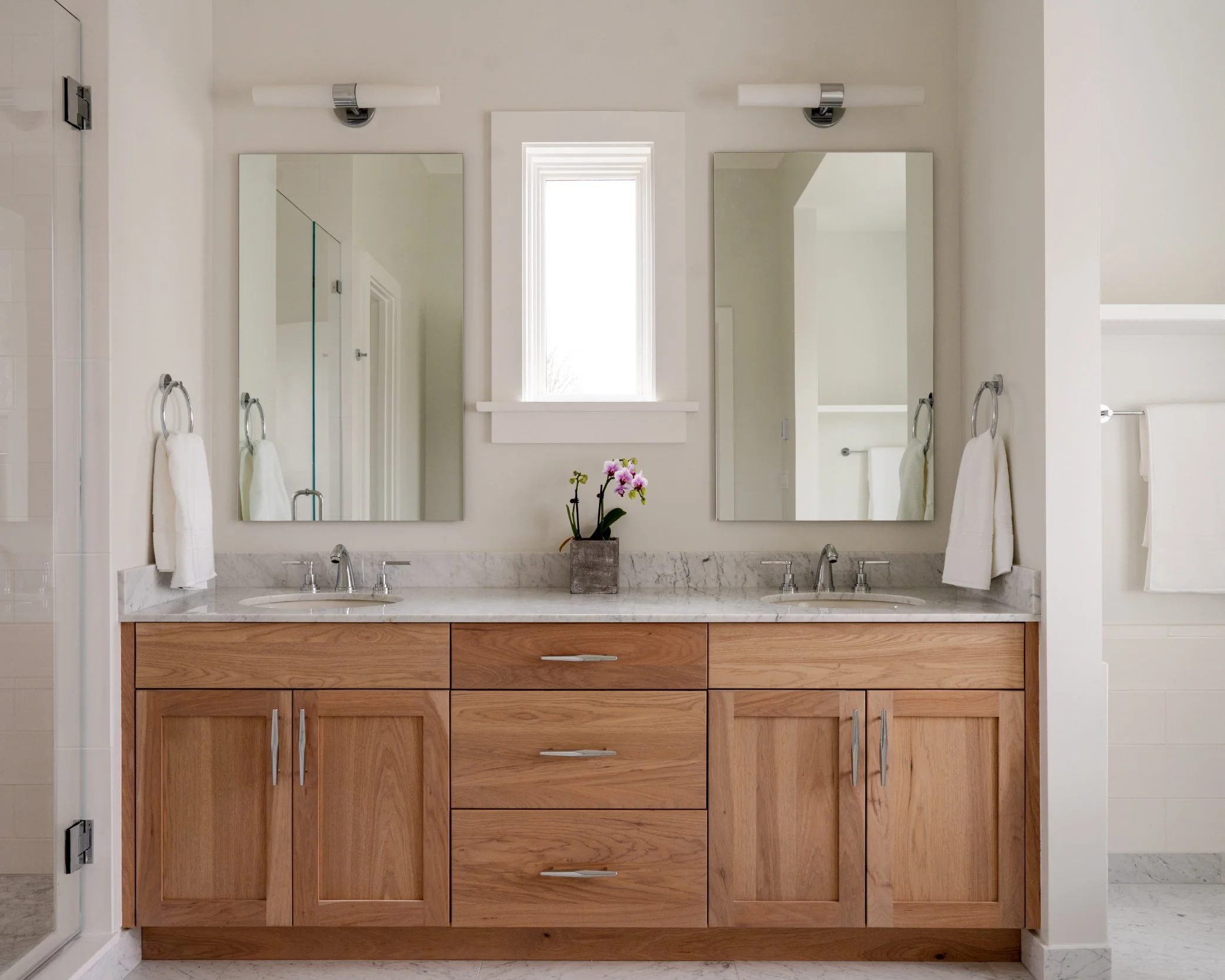 In addition to the kitchen, we also designed this stunning primary bath. We included a double vanity and chose hickory wood with a light stain for the cabinetry. We love how the wild grain of the hickory creates movement in an otherwise still and quiet environment.
