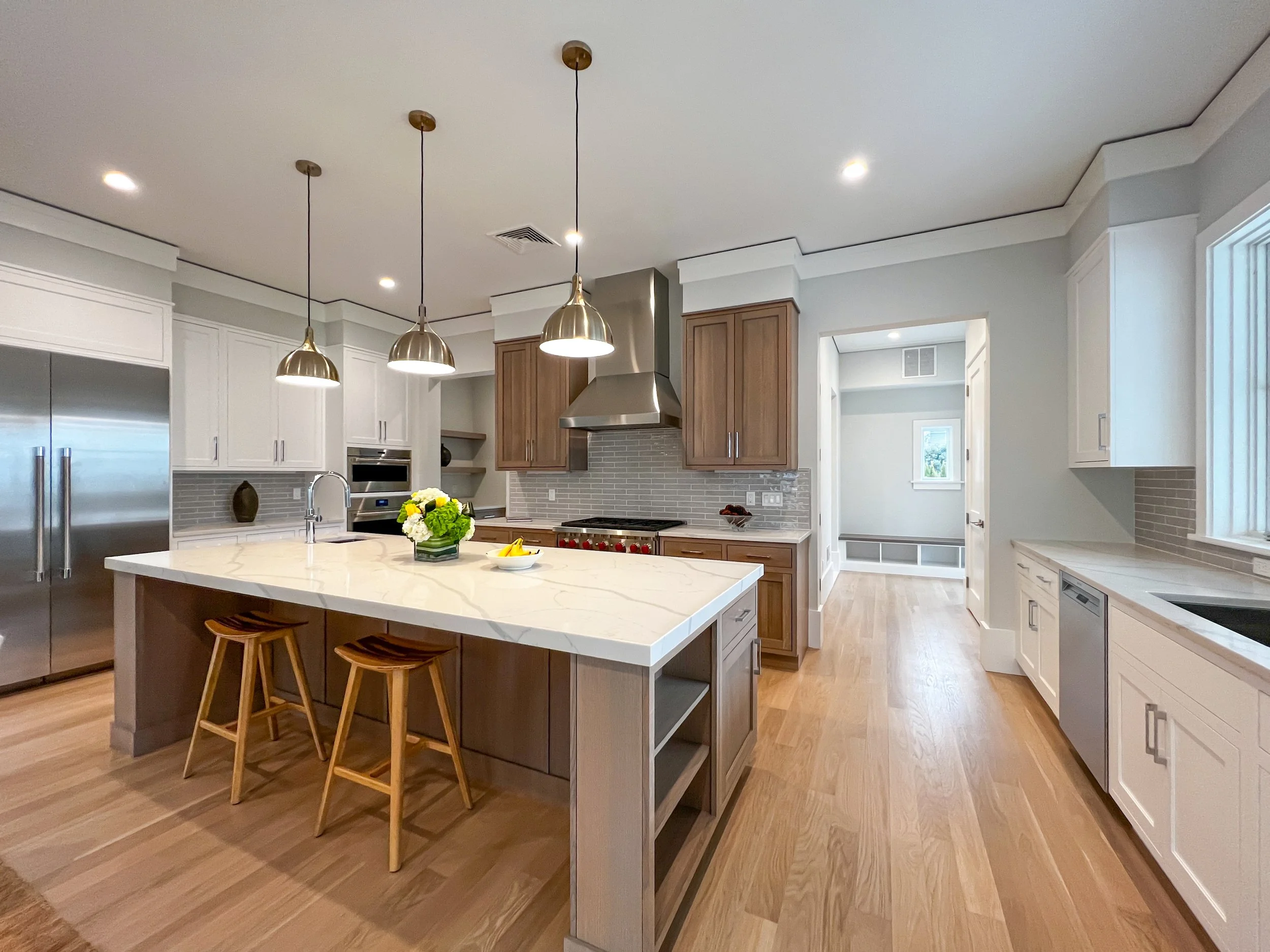 The open concept in the kitchen acts as the heart of the home, featuring a large island and three walls of cabinetry. We created a serene, two-tone space using inset cabinetry from Crystal Cabinets, finished in white paint and stained white oak. The kitchen offers beautiful new appliances, ample storage, a walk-in pantry, counter space for meal prep and plenty of room to sit.