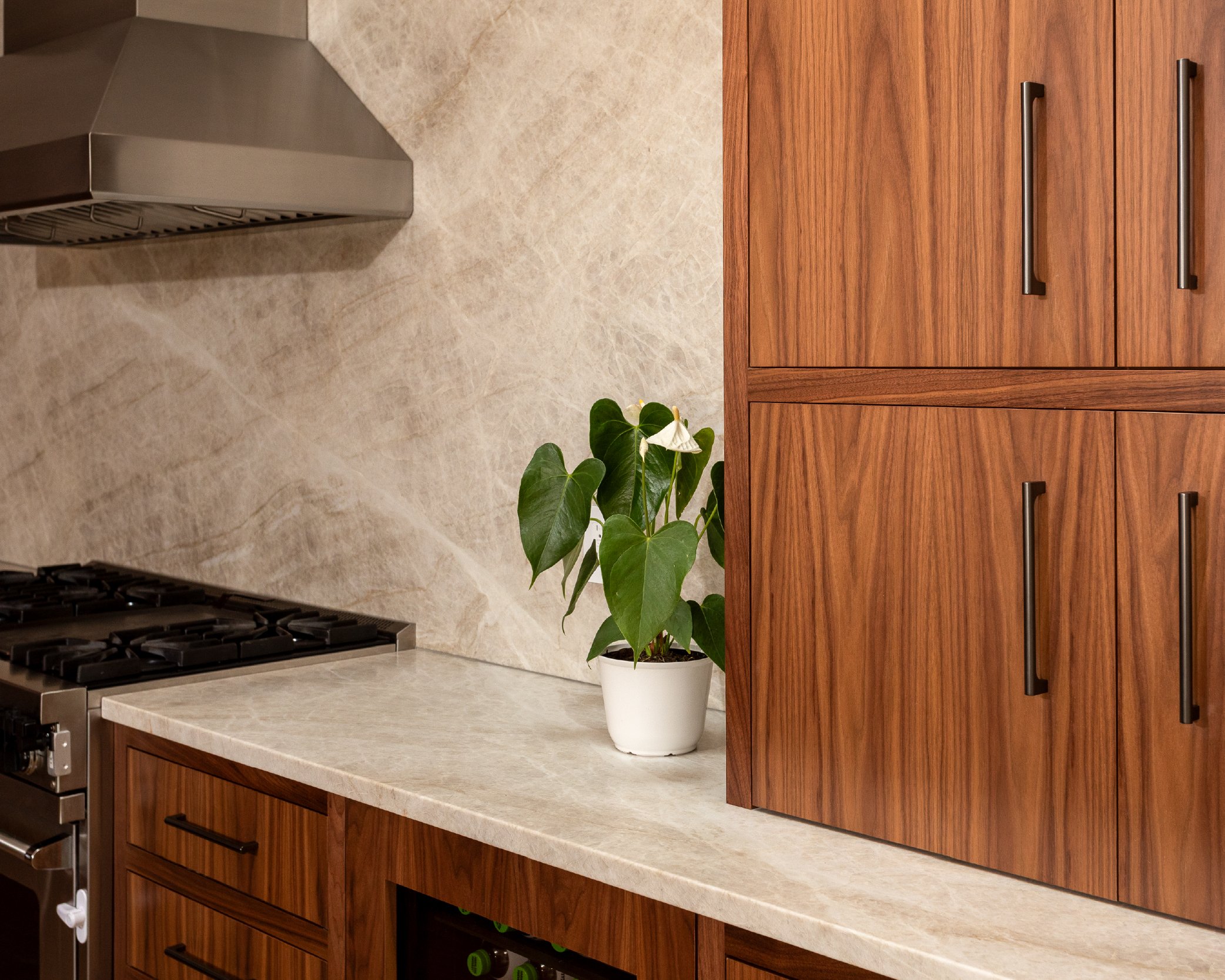 We outfitted this kitchen with custom Craft-Maid cabinetry. Our clients were drawn to the look of flush inset cabinets with slab doors in a natural walnut finish—a style that’s notoriously challenging to execute, as the frame and door often absorb stain differently and can appear mismatched. However, Craft-Maid delivered a seamless, stunning result. The cabinetry is complemented by a striking backsplash behind the hood, made from a single slab of Taj Mahal Quartzite.