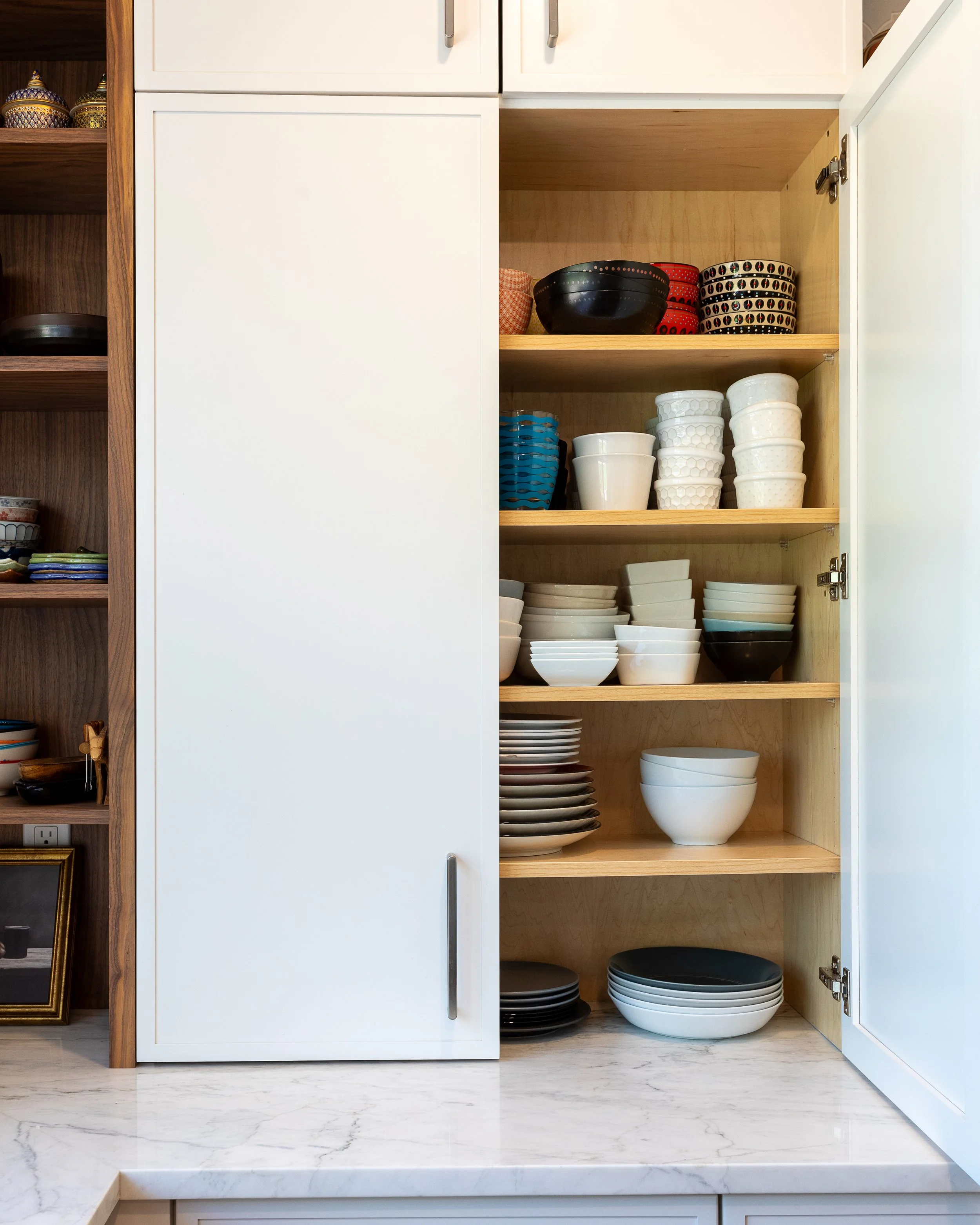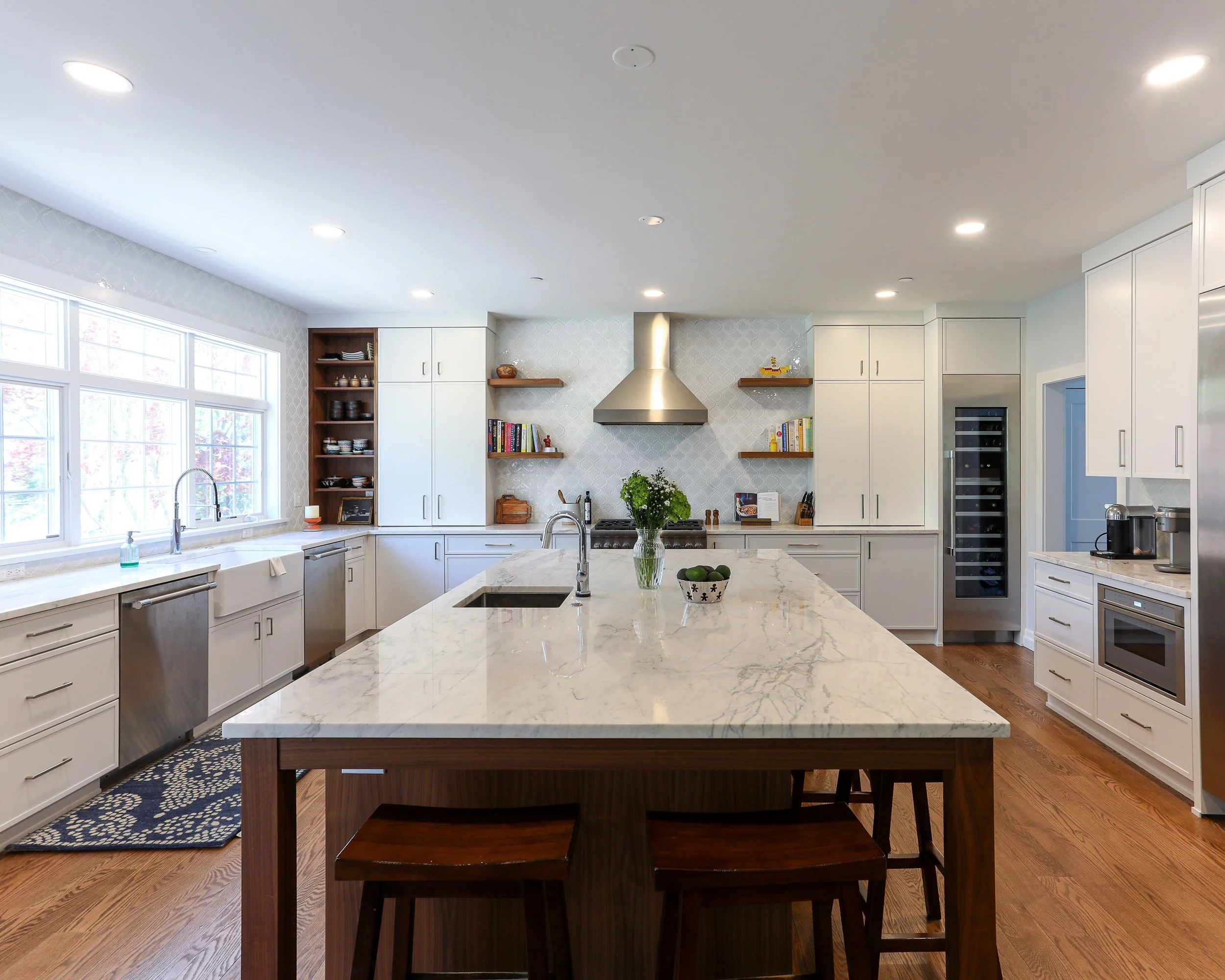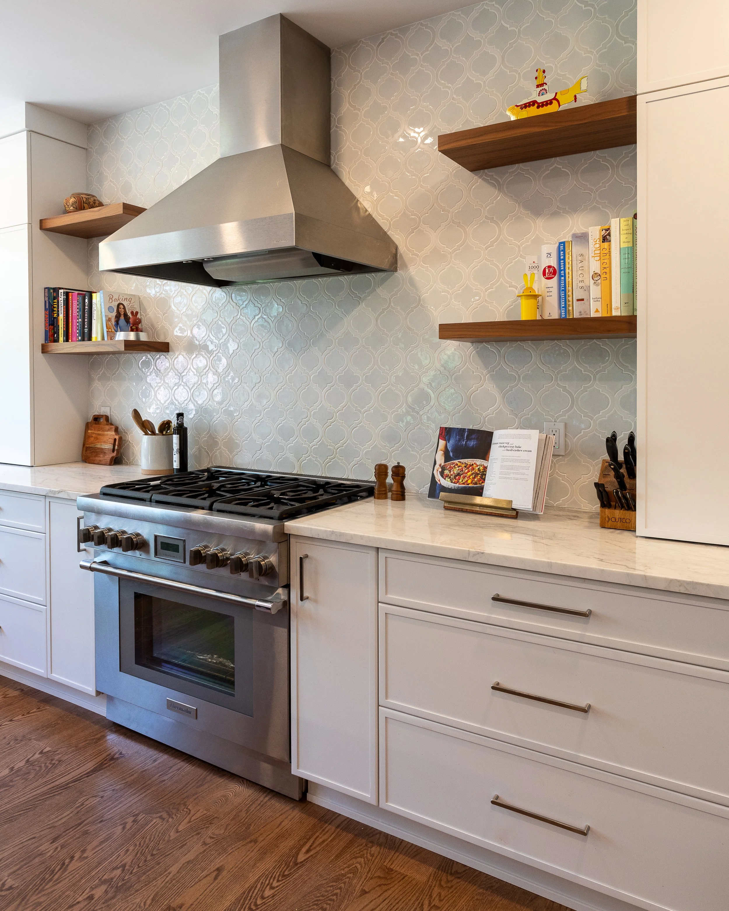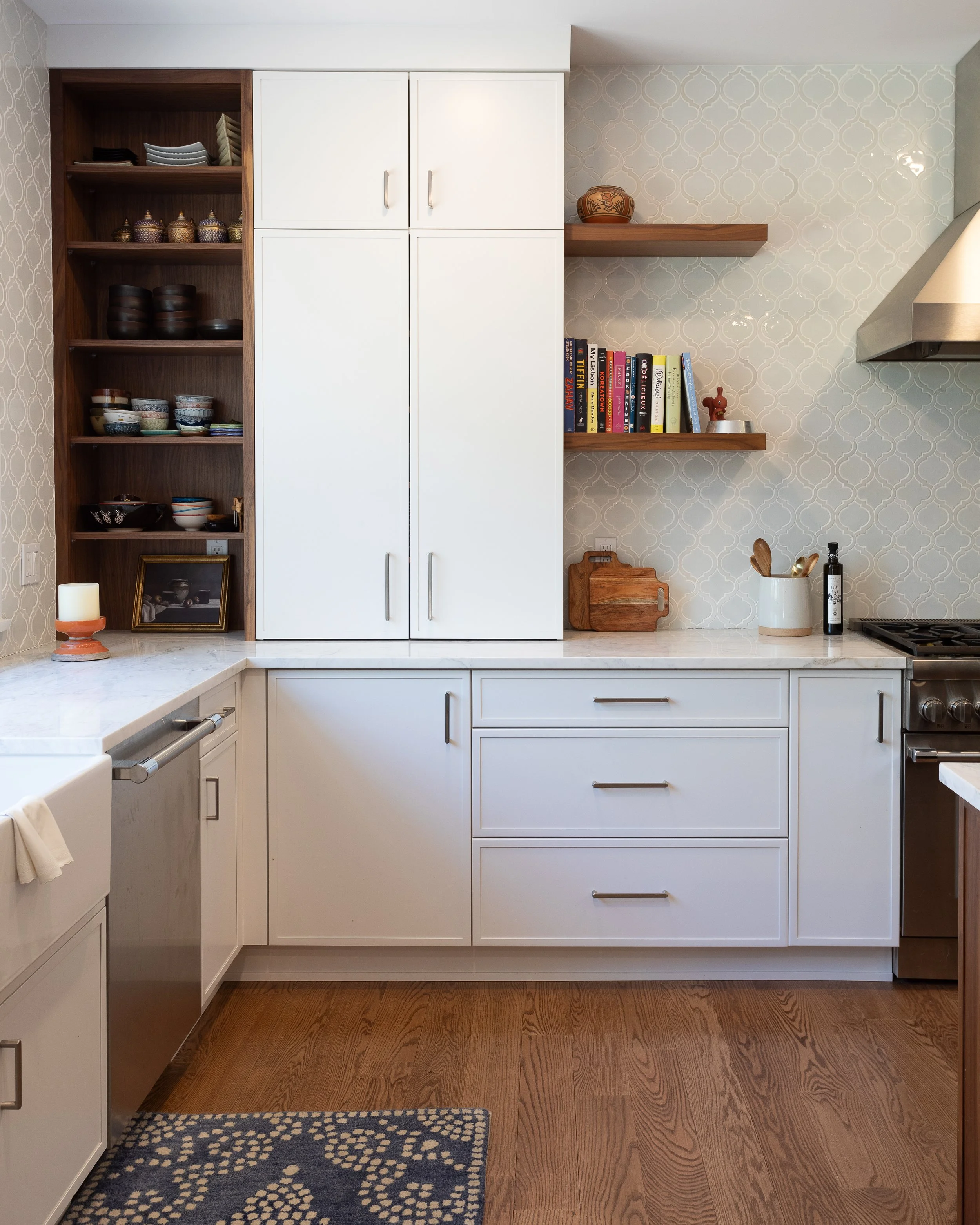 We outfitted the perimeter of the kitchen with counter-height wall cabinets to take advantage of the ample countertop space, allowing for the client to hide small appliances and other odds and ends that we wanted to keep nearby but not on display. The tall ceilings and the wide space around the hood give a feeling of openness. We added pops of walnut (matching the island) on the perimeter to vary up the palette and utilized open shelving so the client could display some colorful items.